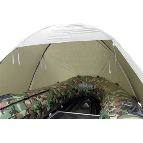 Тент имеет каркасную конструкцию и фиксируется на складных дугах, закрепляемых на держатели лееров на бортах пвх лодки с помощью монтажных хомутов и строп с люверсами. Тент лёгок и компактен в упаковке, прост в монтаже.